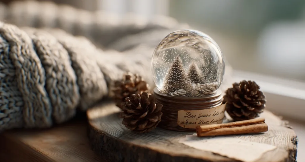 A cozy winter still life featuring a snow globe with miniature pine trees, surrounded by pinecones, cinnamon sticks, and a knitted blanket on a wooden surface. This realistic and warm composition, created using an AI Image Generator, captures the essence of winter nostalgia and seasonal charm.