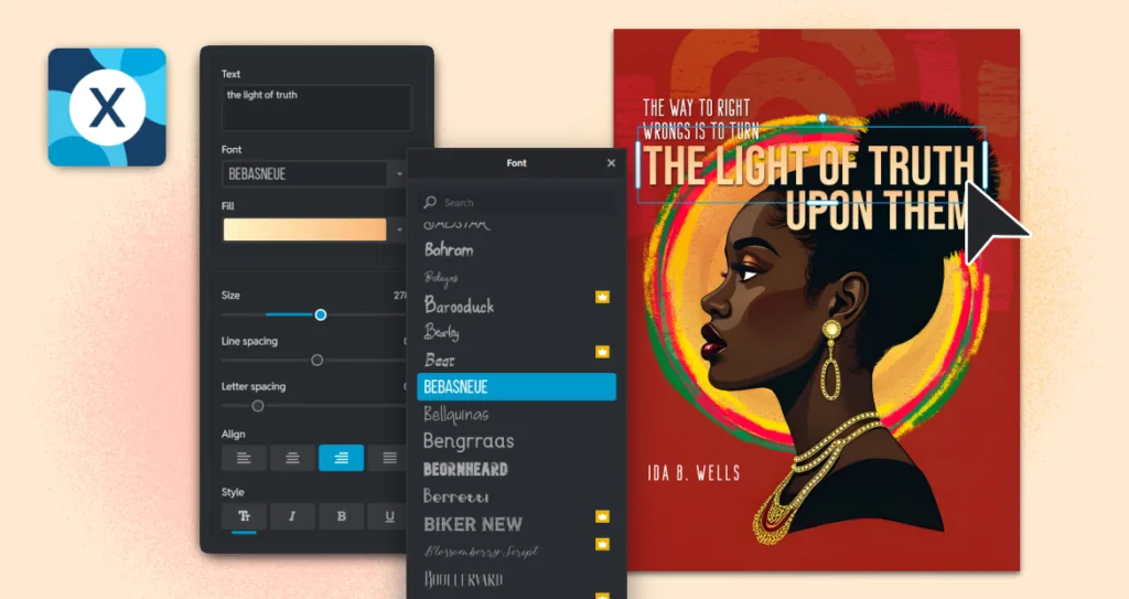 Transform quotes from influential voices such as Maya Angelou or James Baldwin into impactful visual designs. For quick text creation, use Pixlr Nano Banana to instantly turn meaningful words into visual statements. If you prefer more hands on control, Pixlr Express offers a wide range of fonts and text customization tools. You can fine tune font style, wrap text, adjust colors, and add shadows or backgrounds with just a few clicks, ensuring your message remains clear, readable, and visually engaging.