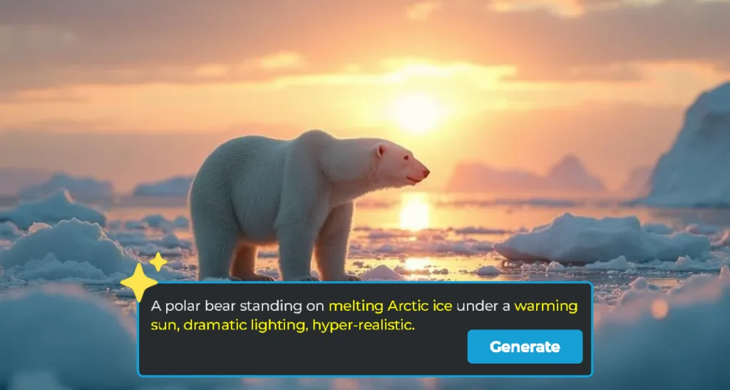Sample prompt: A polar bear standing on melting Arctic ice under a warming sun, dramatic lighting, hyper-realistic.Such visuals help communicate urgency and empathy more effectively than data alone.