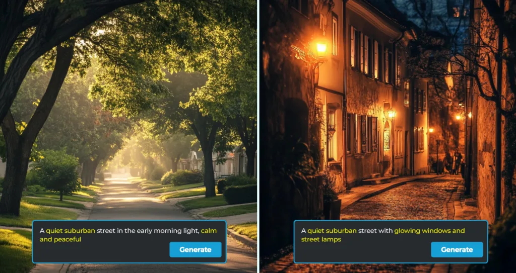 Time of day: “Morning,” “nighttime,” “golden hour”