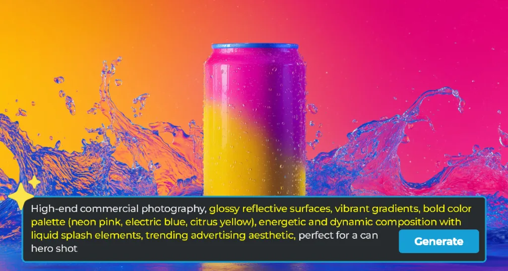 Sample prompt: High-end commercial photography, glossy reflective surfaces, vibrant gradients, bold color palette (neon pink, electric blue, citrus yellow), energetic and dynamic composition with liquid splash elements, trending advertising aesthetic, perfect for a can hero shot