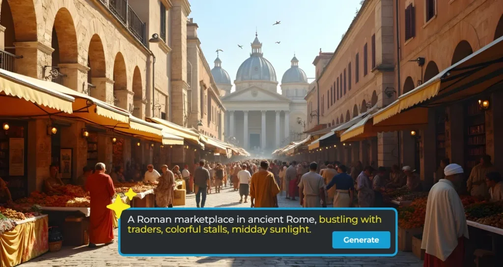 Sample prompt: A Roman marketplace in ancient Rome, bustling with traders, colorful stalls, midday sunlight.