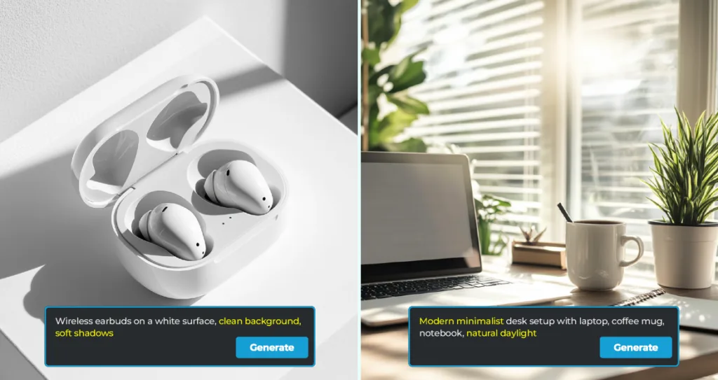 Sample prompt 2: Modern minimalist desk setup with laptop, coffee mug, notebook, natural daylight