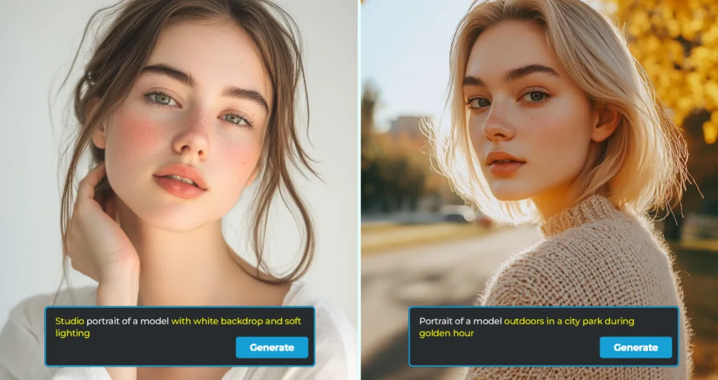 Sample prompt 2: Portrait of a model outdoors in a city park during golden hour