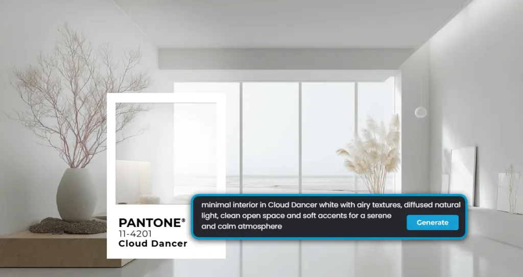 These lighting cues help AI produce images that feel fresh, balanced, and atmospheric. The right light brings out the subtle depth within Cloud Dancer’s white tones and reinforces its calming, elevated mood.